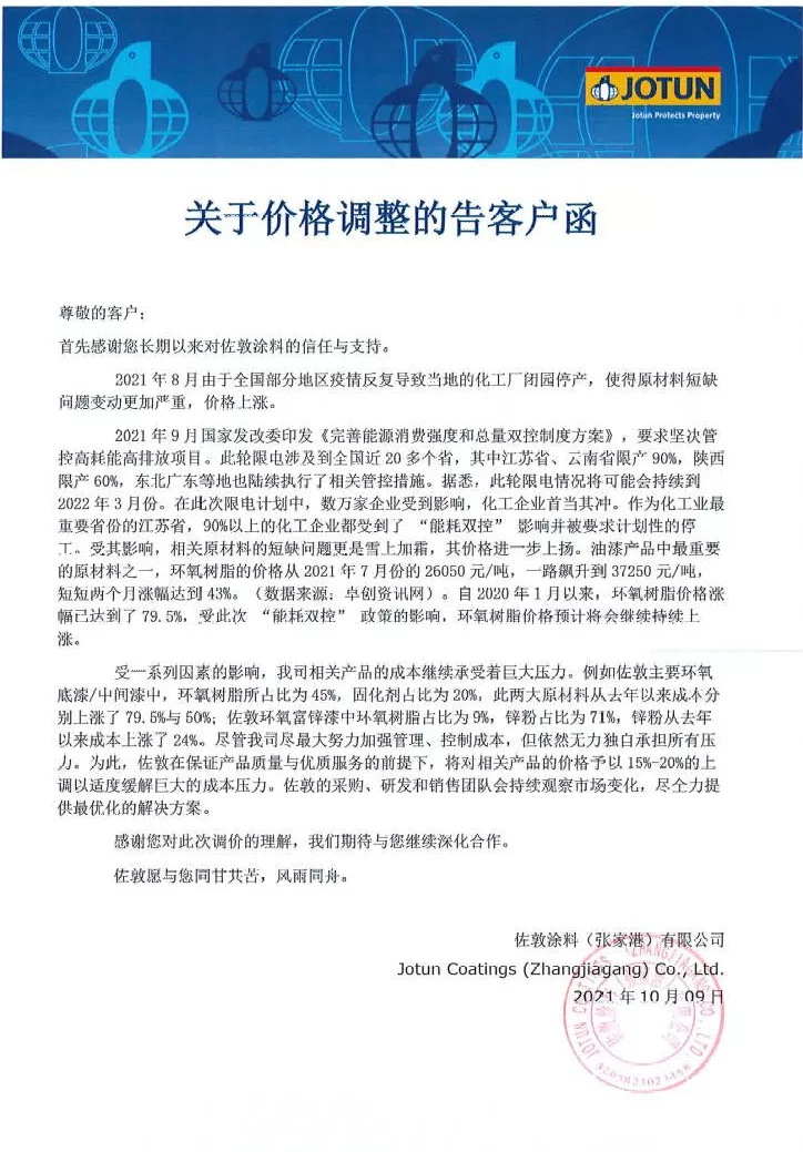 受一系列因素的影響,我司相關(guān)產(chǎn)品的成本繼續(xù)承受著巨大壓力。例如佐敦主要環(huán)氧底漆/中間漆中,環(huán)氧樹脂所占比為45%,固化劑占比為20%,此兩大原材料從去年以來成本分別上漲了79.5%與50%;佐敦環(huán)氧富鋅漆中環(huán)氧樹脂占比為9%,鋅粉占比為71%,鋅粉從去年以來成本上漲了24%。盡管我司盡最大努力加強管理、控制成本,但依然無力獨自承擔(dān)所有壓力。為此,佐敦在保證產(chǎn)品質(zhì)量與優(yōu)質(zhì)服務(wù)的前提下,將對相關(guān)產(chǎn)品的價格予以15%-20%的上調(diào)以適度緩解巨大的成本壓力。佐敦的采購、研發(fā)和銷售團隊會持續(xù)觀察市場變化,盡全力提供最優(yōu)化的解決方案。