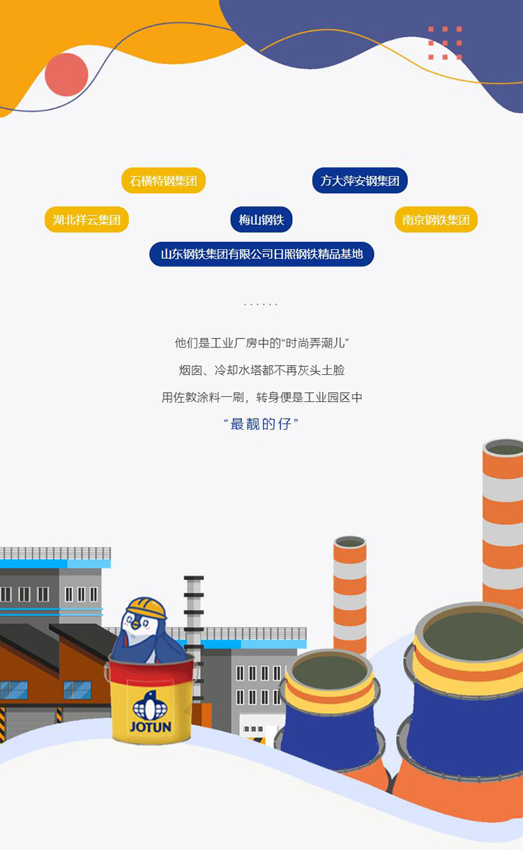 佐敦涂料攜手在業(yè)內(nèi)擁有超過30年高空施工經(jīng)驗(yàn)的施工團(tuán)隊,為各類正在轉(zhuǎn)型的鋼鐵企業(yè)提供維修、防腐、美化服務(wù)。佐敦為此類美化服務(wù)提供專業(yè)的油漆配套,鋼廠美化專用的高性能涂料體系,不僅可以配合施工隊的快速施工,而且調(diào)色方便、調(diào)色空間大,能基于環(huán)保的基礎(chǔ)上更方便、精準(zhǔn)地展現(xiàn)出業(yè)主及設(shè)計師的設(shè)計理念。